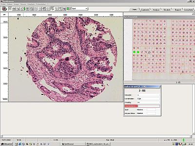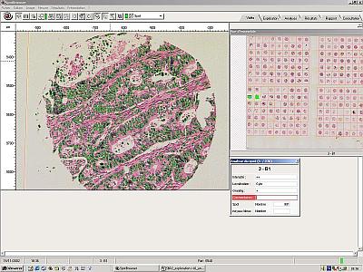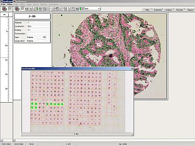 Reviewing a tissue array analysis with the original slide under the microscope allows rapid relocation of the spots through the dynamic link between tables and spot position. This allows the user to visualise the spot together with the results previously recorded for possible modification.